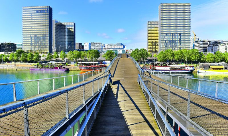 Seit 2006 verbindet die Passerelle Simone-de-Beauvoir die Bibliothek mit dem Parc de Bercy am rechten Seineufer. Die wellenförmige Fußgängerbrücke ist ein Entwurf des Architekten Dietmar Feichtinger, bei dem Ihr Fachleiter Jörg Sperner zu jener Zeit in Aachen studierte. So kennt er einige spannende Details zu der preisgekrönten Konstruktion. Zudem bietet sich ein Blick auf eines der neu entstandenen Schwimmbäder in der Seine.